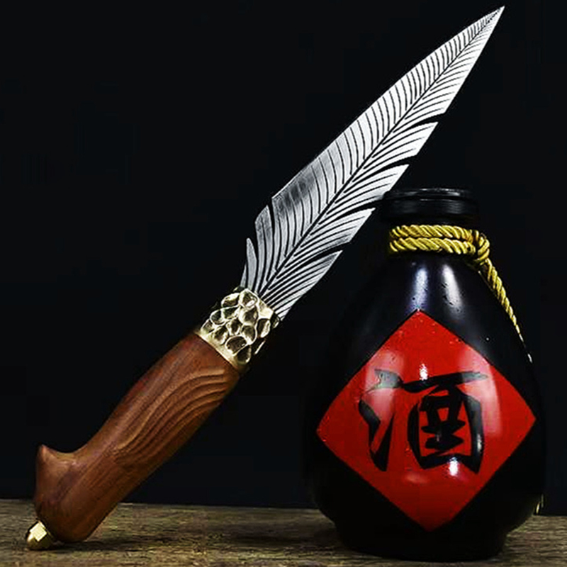 La réception du colis s’est faite rapidement : 5 semaines après commande ! Le couteau de chasse, avec lame imitation plume est original, exactement comme dans l’annonce. Il est bien tranchant et bien pointu. Pour ma part, je le garde comme décoration, car l’utiliser en cuisine régulièrement n’est peut-être pas vraiment recommandé ? Il risque d’accrocher avec ses fentes et risque aussi de rouiller si on ne mets pas d’huile sur la lame pour la protéger, parce que c’est de l’acier et non de l’inox ! Cependant, je suis pleinement satisfait de mon achat et je recommande ce vendeur en particulier pour les collectionneurs de beaux couteaux !